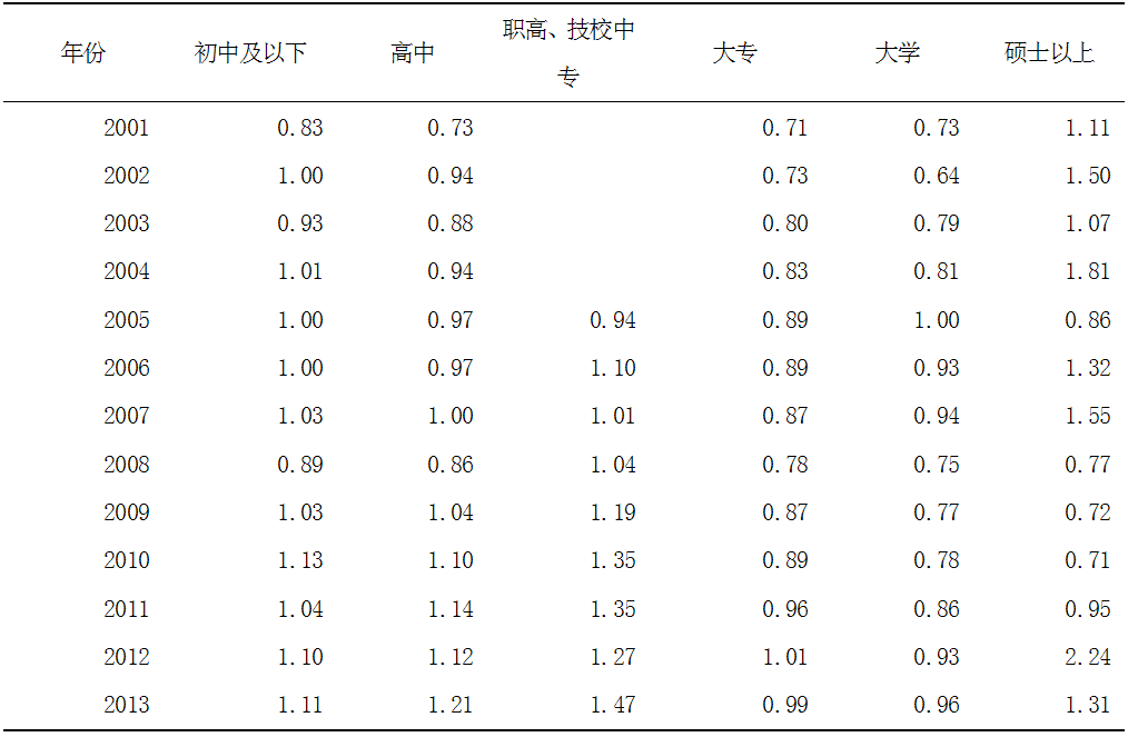 改革开放以来,我国经济规模迅速扩张。放眼世界,两位数的增长率创造了“中国经济奇迹”(林毅夫等,1999)。这其中,“人口红利”发挥了重要作用(蔡昉,2010),大量农村剩余劳动力从农业部门流向工业部门,为工业尤其加工贸易生产提供了丰富的低价劳动力(见表1)。这种以规模和速度为主要特征的粗放型增长,对人力资本质量的要求相对较低。