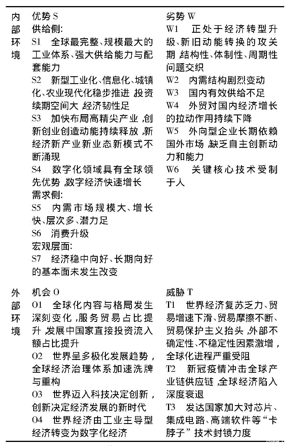 双循环新发展格局这一重大战略构想的提出,是应对世界百年未有之大变局和当前国内外经济形势变化的应然之策(见表1)。从外部环境上看,既有机遇也面临挑战,既要面对国际贸易环境发生根本性转变与新冠肺炎疫情冲击的双重影响,也迎来世界经济格局演变和全球治理模式重构的难得历史机遇。从内部环境看,国内经济处于转型升级和迈向高质量发展的关键攻坚期,增速放缓、内需结构剧变、有效供给不足、关键核心技术受制于人等问题交织,但拥有全球最完整、规模最庞大、门类最齐全的工业体系、强大的供给能力与完善的配套能力,经济韧性足,超大市场规模优势日益凸显,数字经济快速发展等也有力保障了我国经济长期向好的基本面。