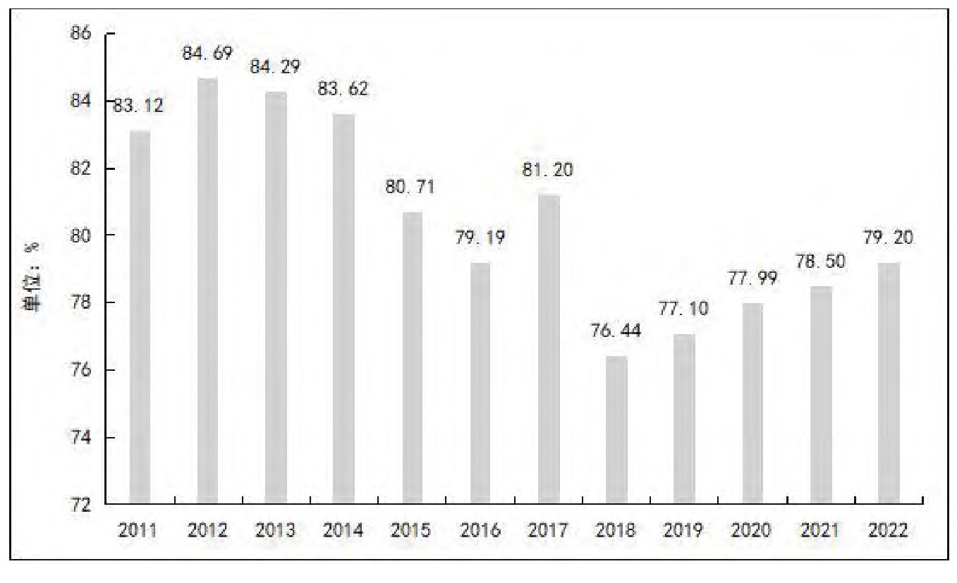 进一步从企业行为角度看,考虑到引进国外技术、消化吸收技术以及购买国内技术也是技术创新活动的重要内容[5],将技改投资放到技术创新活动这一更大范围内考察,发现前者在后者中的占比呈现规模有所恢复与整体平稳趋势。2011—2016年,规模以上工业企业技改经费支出规模在4类技术创新活动经费支出规模中的占比呈快速下降趋势,2017年反弹至81.20%,2018年虽然下降至76.44%,但2022年又上升为79.2%(见图2)。