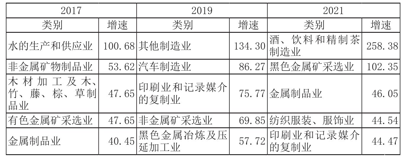 从增速角度看,2017年,排名前5位的产业分别是水的生产和供应业,非金属矿物制品业,木材加工及木、竹、藤、棕、草制品业,有色金属矿采选业,金属制品业,技改经费支出规模增速分别为100.68%、53.62%、47.65%、47.65%、40.45%。2021年,排名前5位的产业分别是酒、饮料和精制茶制造业,黑色金属矿采选业,金属制品业,纺织服装、服饰业,印刷业和记录媒介的复制业,技改经费支出规模增速分别为258.38%、102.35%、46.05%、44.54%、44.47%。这也在一定程度上表明传统产业技改需求更为迫切2(见表2)。